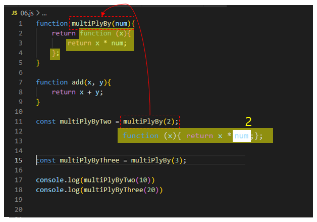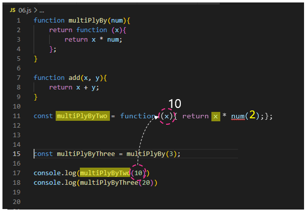 // addFive(function(10){return 10 + 5;}; // return x + sum = 10 + 5 = 15가 된다.