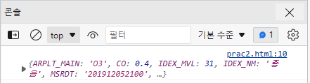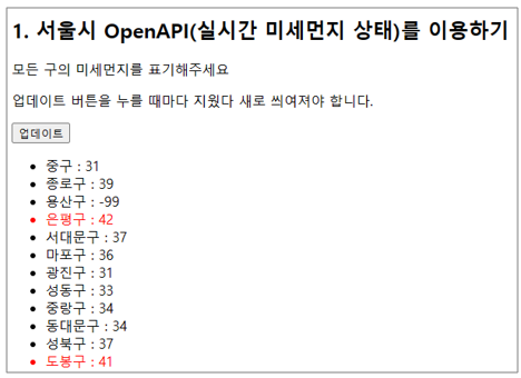 - 버튼을 누르면 기존 리스트 내용은 지우고 구('MSRSTE_NM')와 미세먼지 수치('IDEX_MVL')를 보여주자