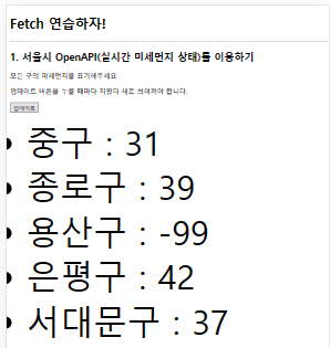 fetch("http://spartacodingclub.shop/sparta_api/seoulair").then(res => res.json()).then(data => {